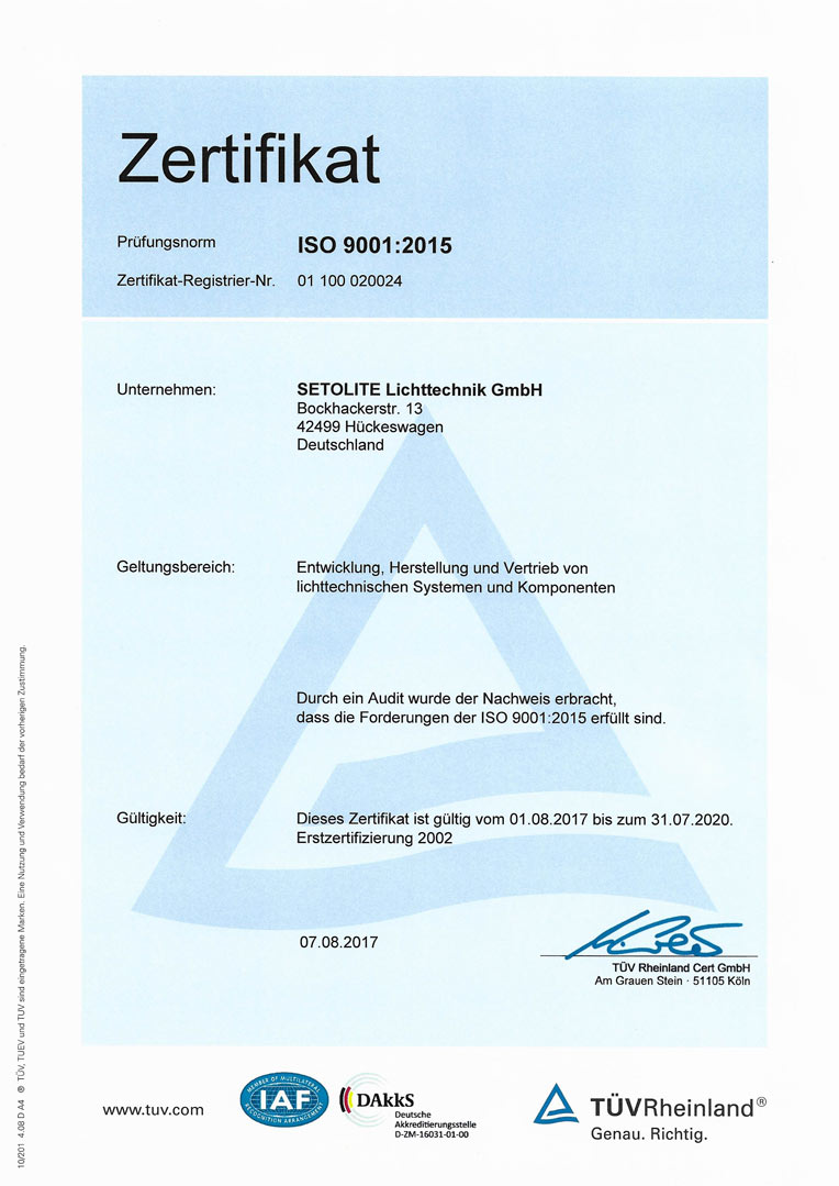 Schon in diesem Jahr hat sich SETOLITE Lichttechnik GmbH dazu entschlossen, auf die neue Norm DIN ISO 9001:2015 umzuschwenken, da die weitreichenden Änderungen bereits implementiert werden konnten.